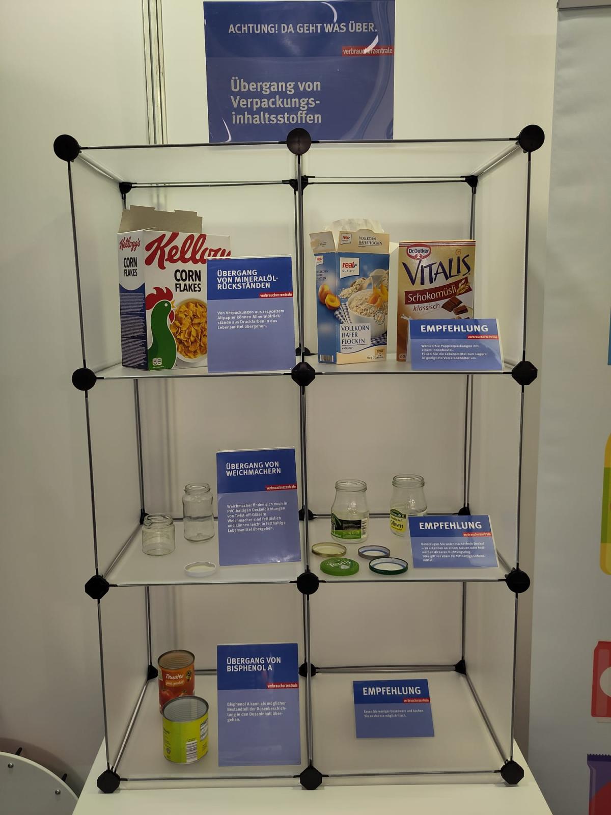 In unserer modularen Ausstellung nehmen wir unter anderem die verschiedenen Kontaktmaterialien für Lebensmittel unter die Lupe. Anhand von Beispielen informieren wir über die Risiken, klären über den richtigen Umgang auf und zeigen mögliche Alternativen.