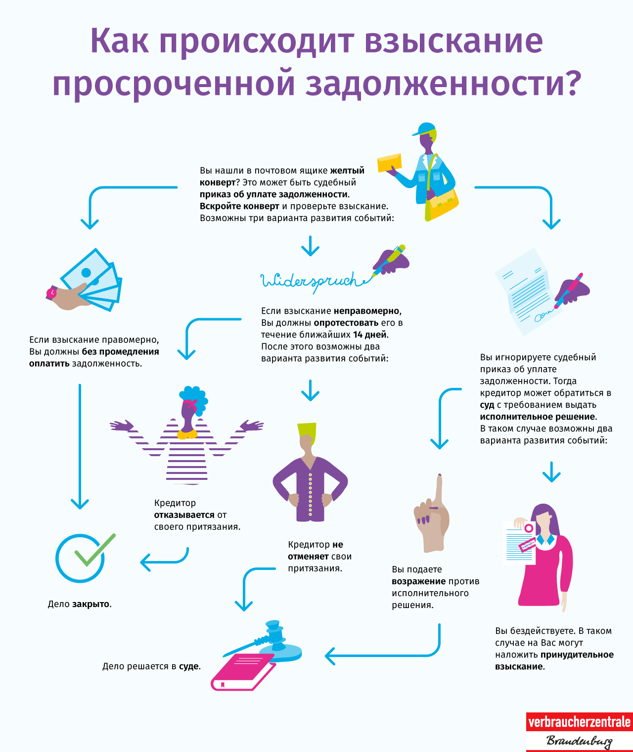 Если Вы нашли в почтовом ящике судебный приказ об уплате задолженности, то бездействовать нельзя. В этом графике объясняется, как происходит взыскание просроченной задолженности и что делать, если Вы получили судебный приказ об уплате задолженности — начиная с проверки его правомерности, возможности его (частично) опротестовать и заканчивая оплатой задолженности.