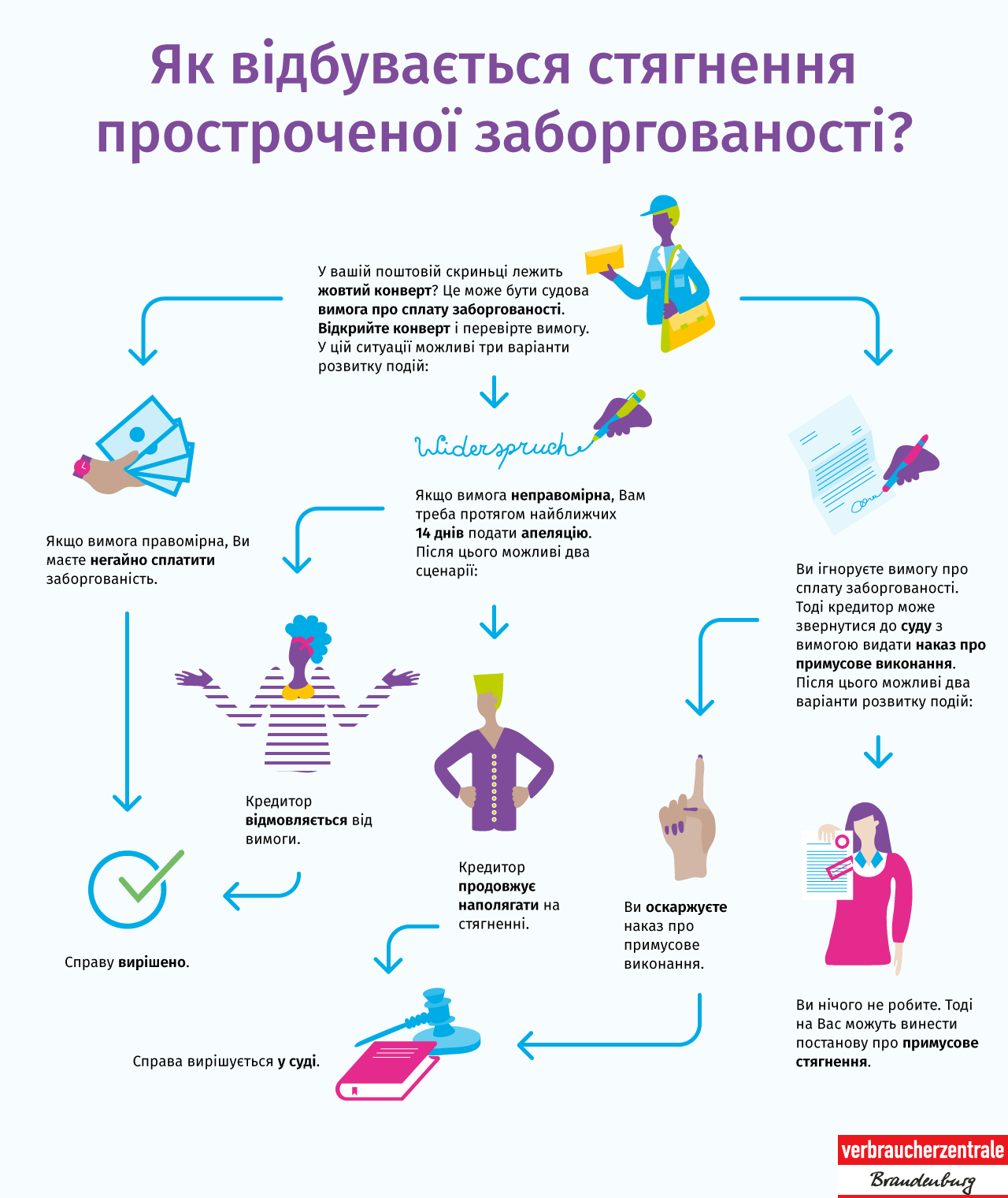 Якщо Ви знайшли у поштовій скриньці судову вимогу про сплату заборгованості, Вам потрібно діяти швидко. У цьому зображенні пояснюється, яким чином відбувається стягнення простроченої заборгованості, а також що робити, якщо Ви отримали вимогу про сплату заборгованості. Ви побачите пояснення до усіх можливих сценаріїв — від перевірки правомірності вимоги та можливості (часткового) оскарження до сплати заборгованості.