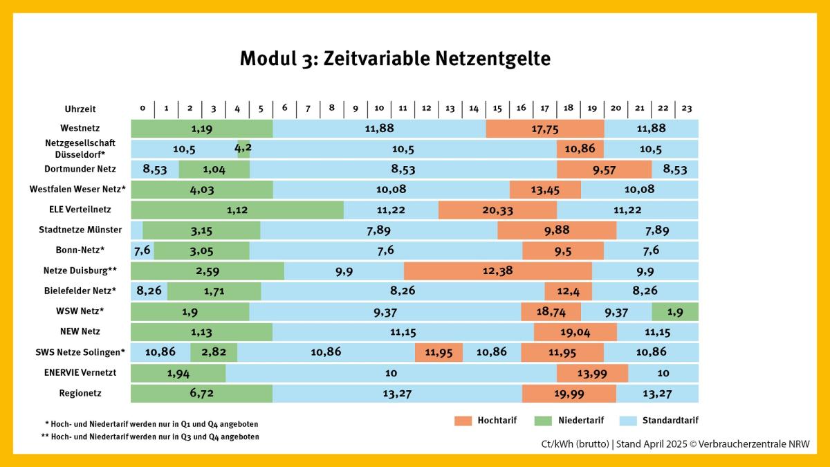 • In vielen Netzgebieten sind die Netzentgelte nachts günstiger, während nachmittags oder in den frühen Abendstunden hohen Netzentgelte gelten.
